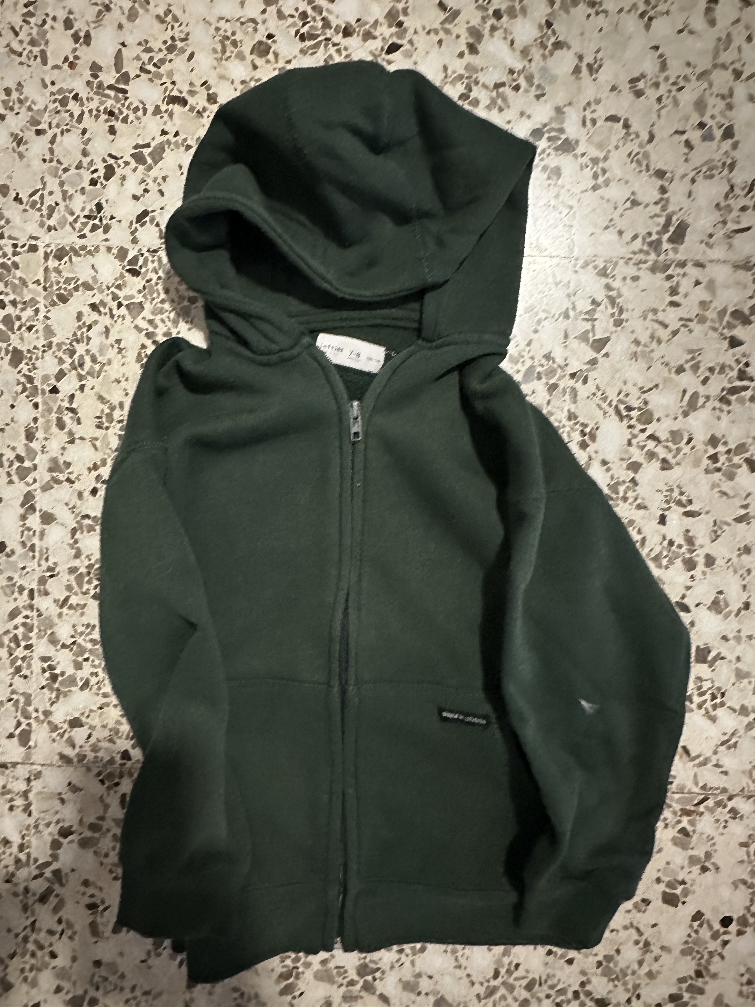 Sudadera verde con capucha y cremallera, etiqueta “Best Dude”.