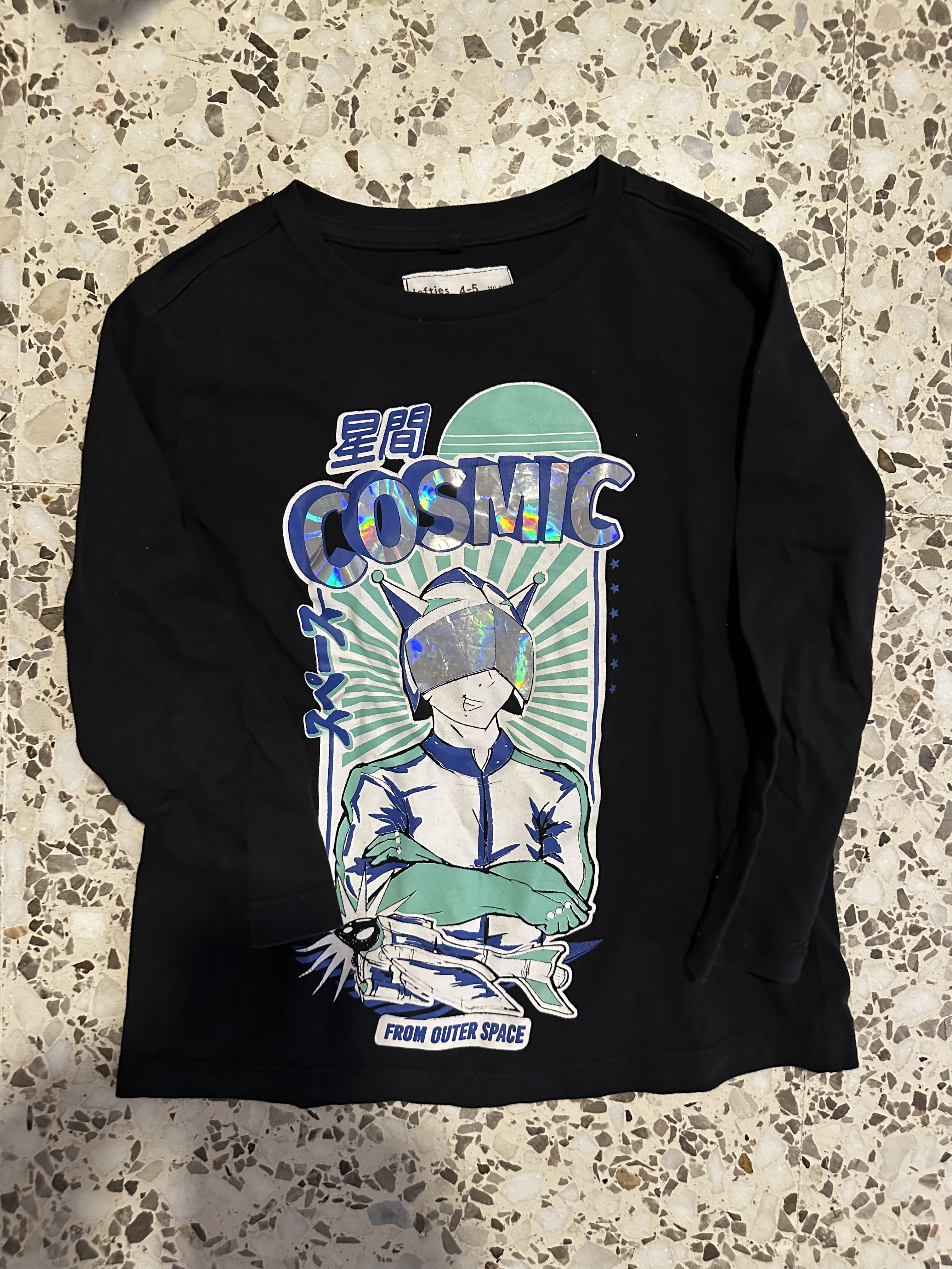 Camiseta con diseño cósmico holográfico y texto ‘COSMIC – From outer space’.