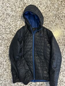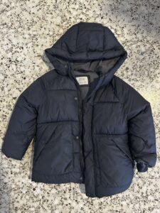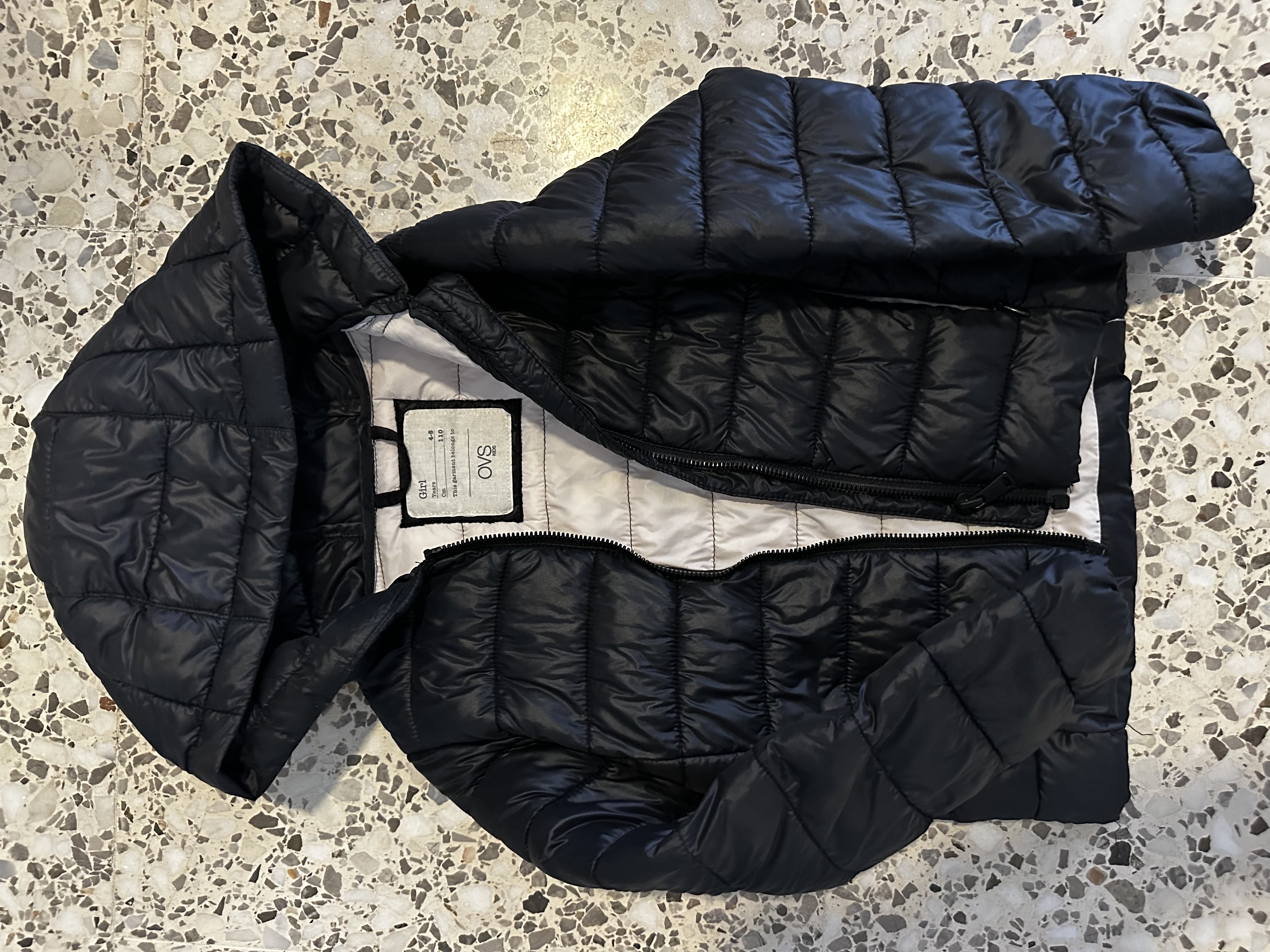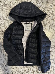 Abrigo acolchado negro con capucha, interior claro.