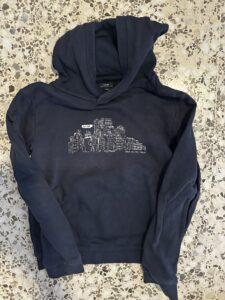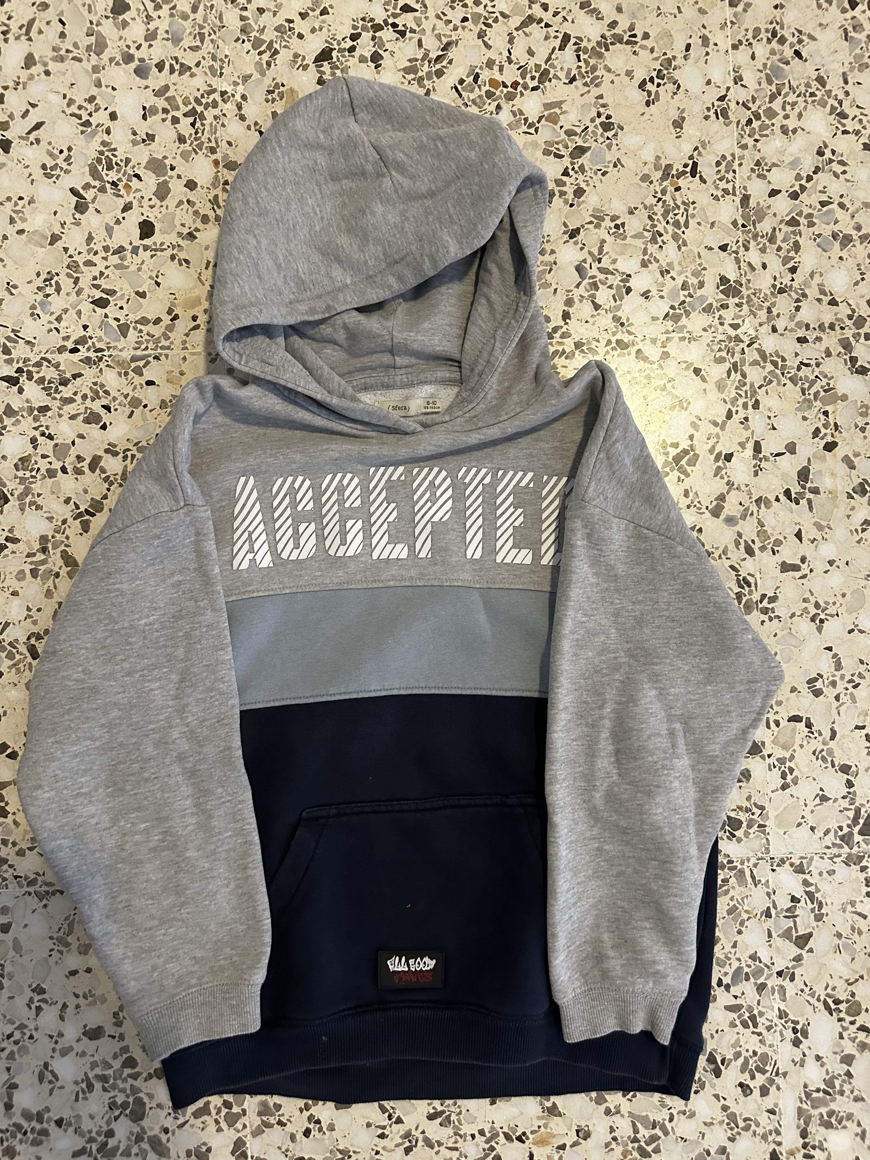 Sudadera con capucha, franjas grises y azul marino, texto “Accepted”.