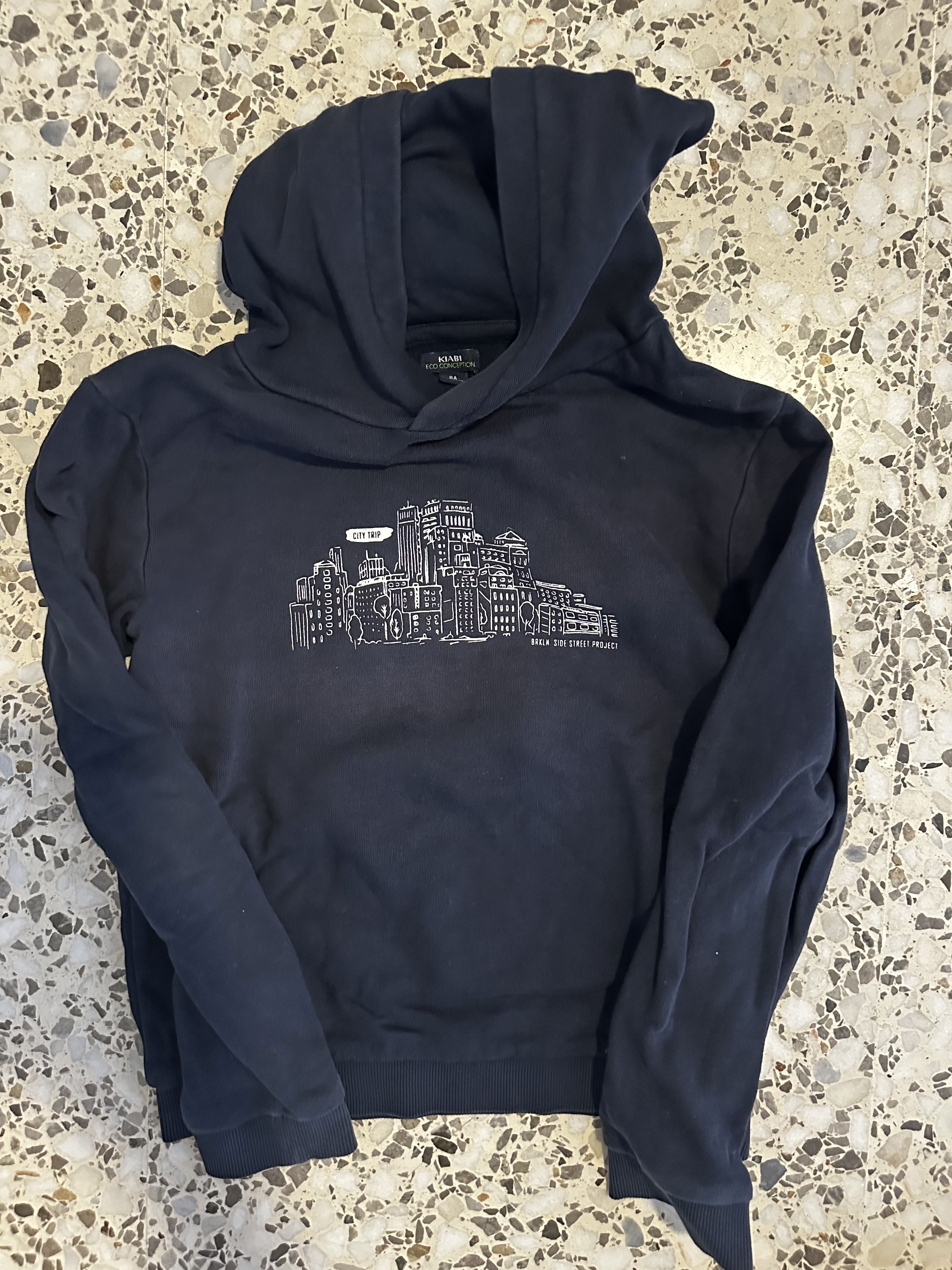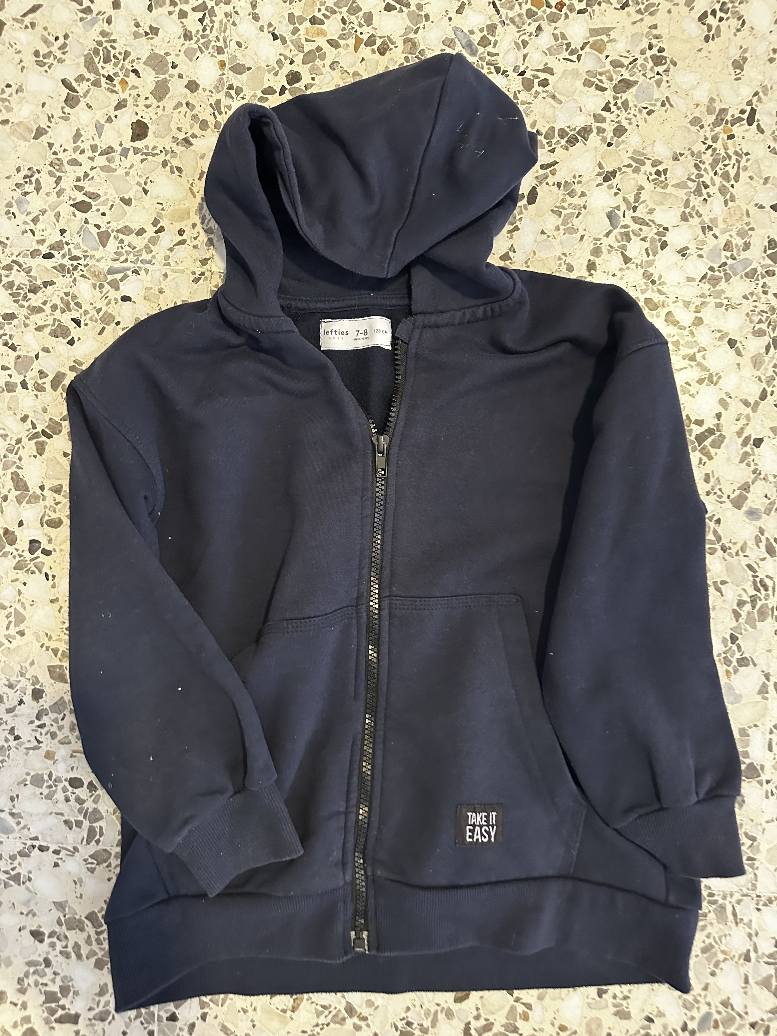 Sudadera azul marino con capucha, cremallera, “Take it Easy”.