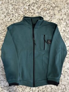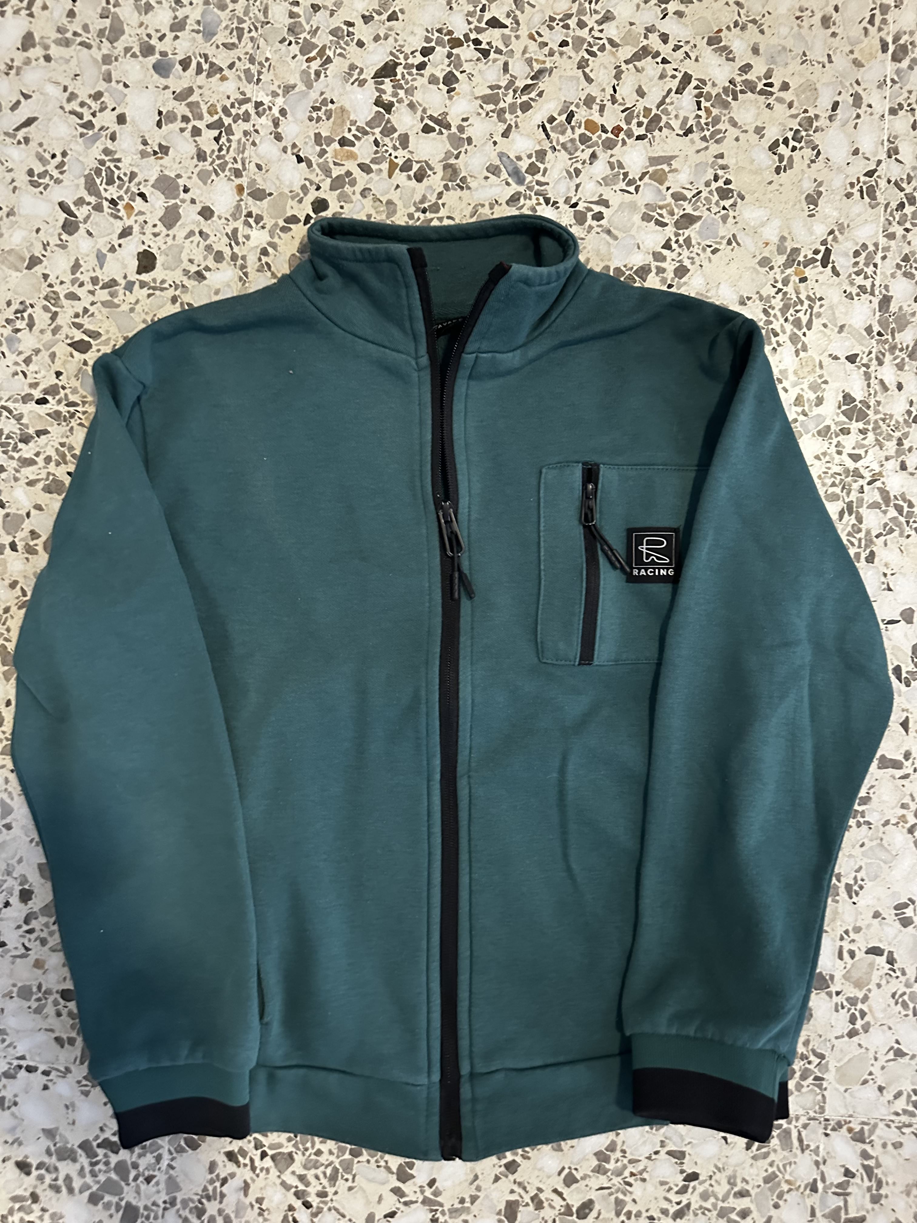 Chaqueta verde con cremallera completa y bolsillo frontal.