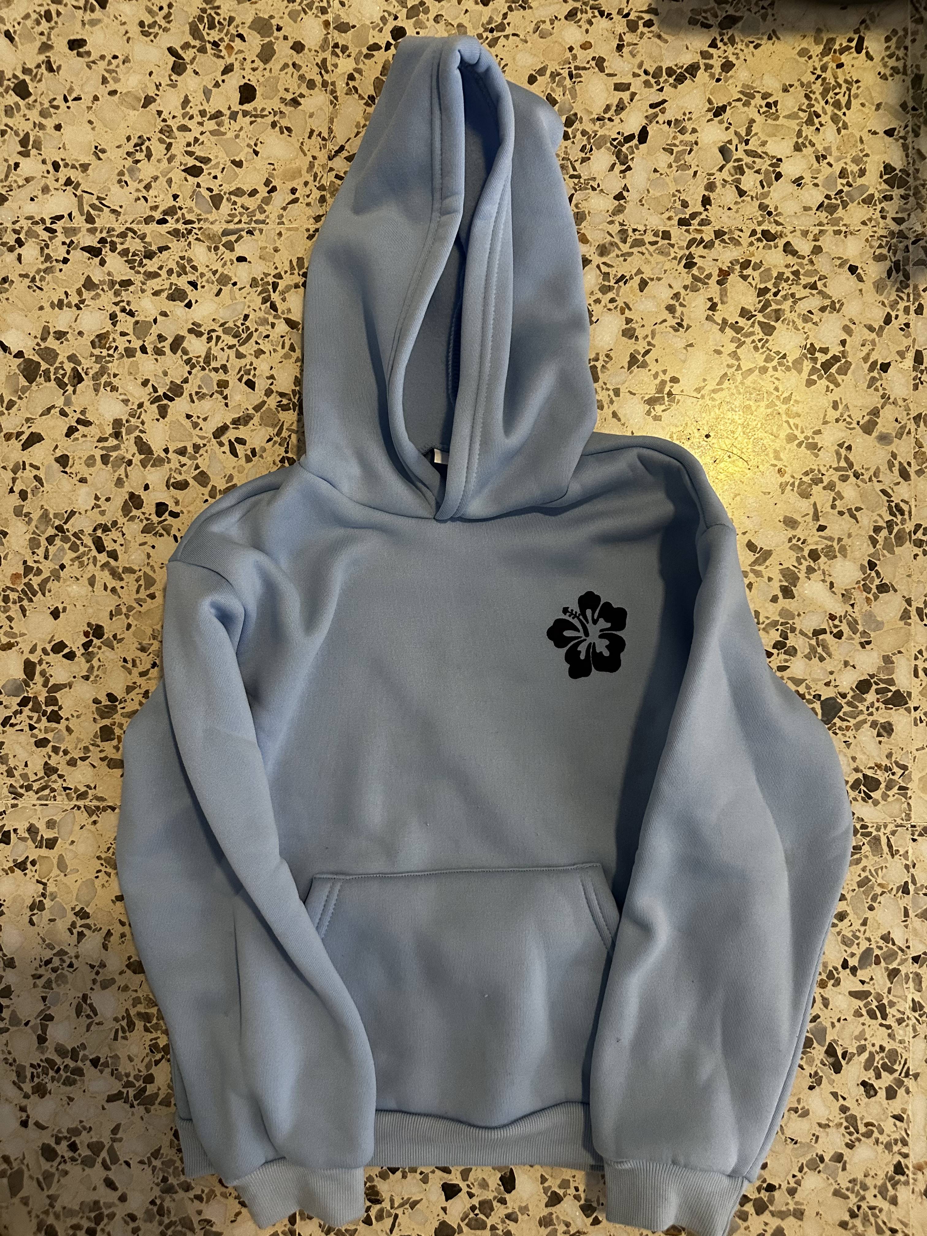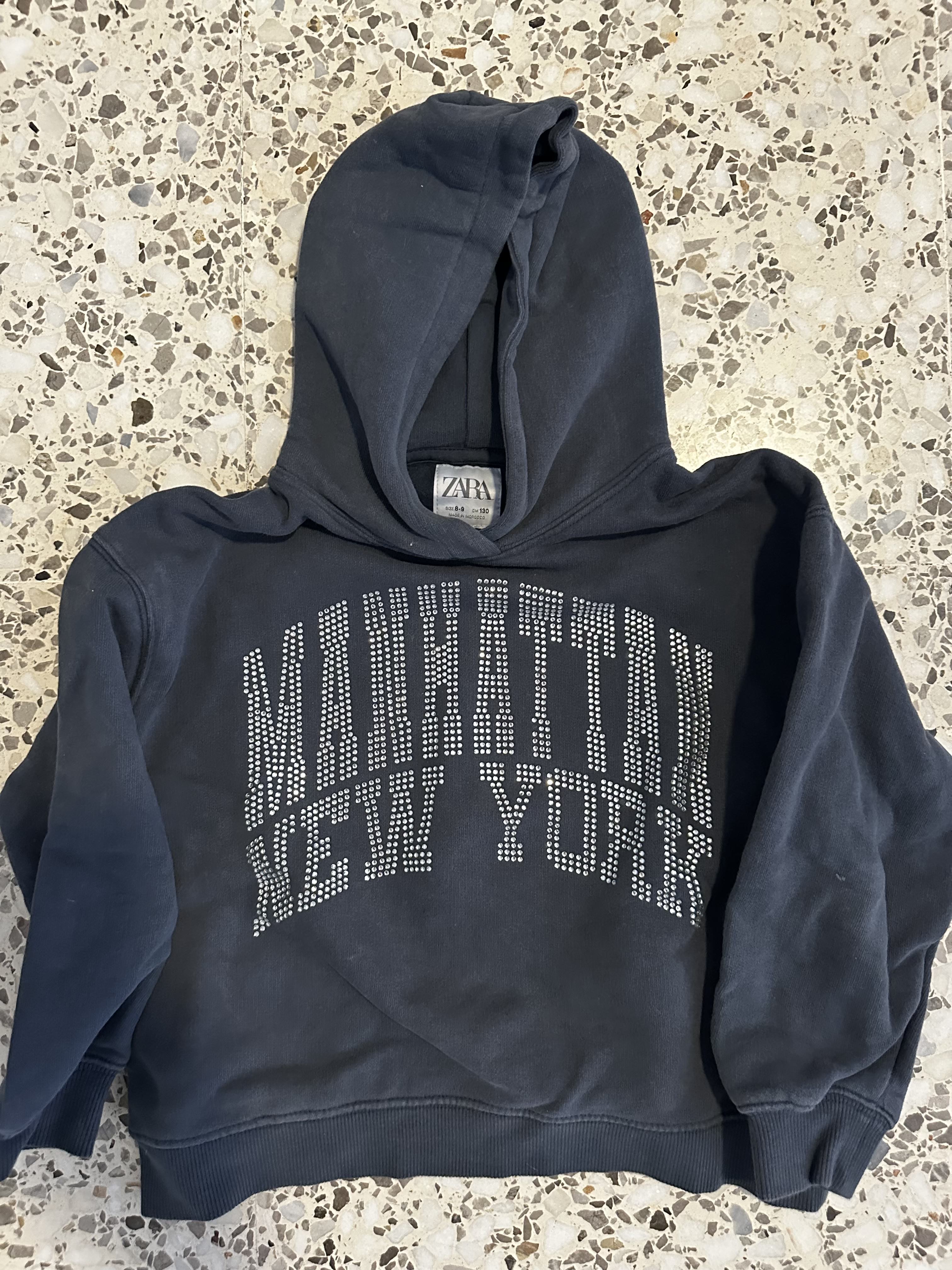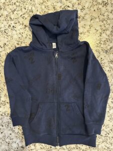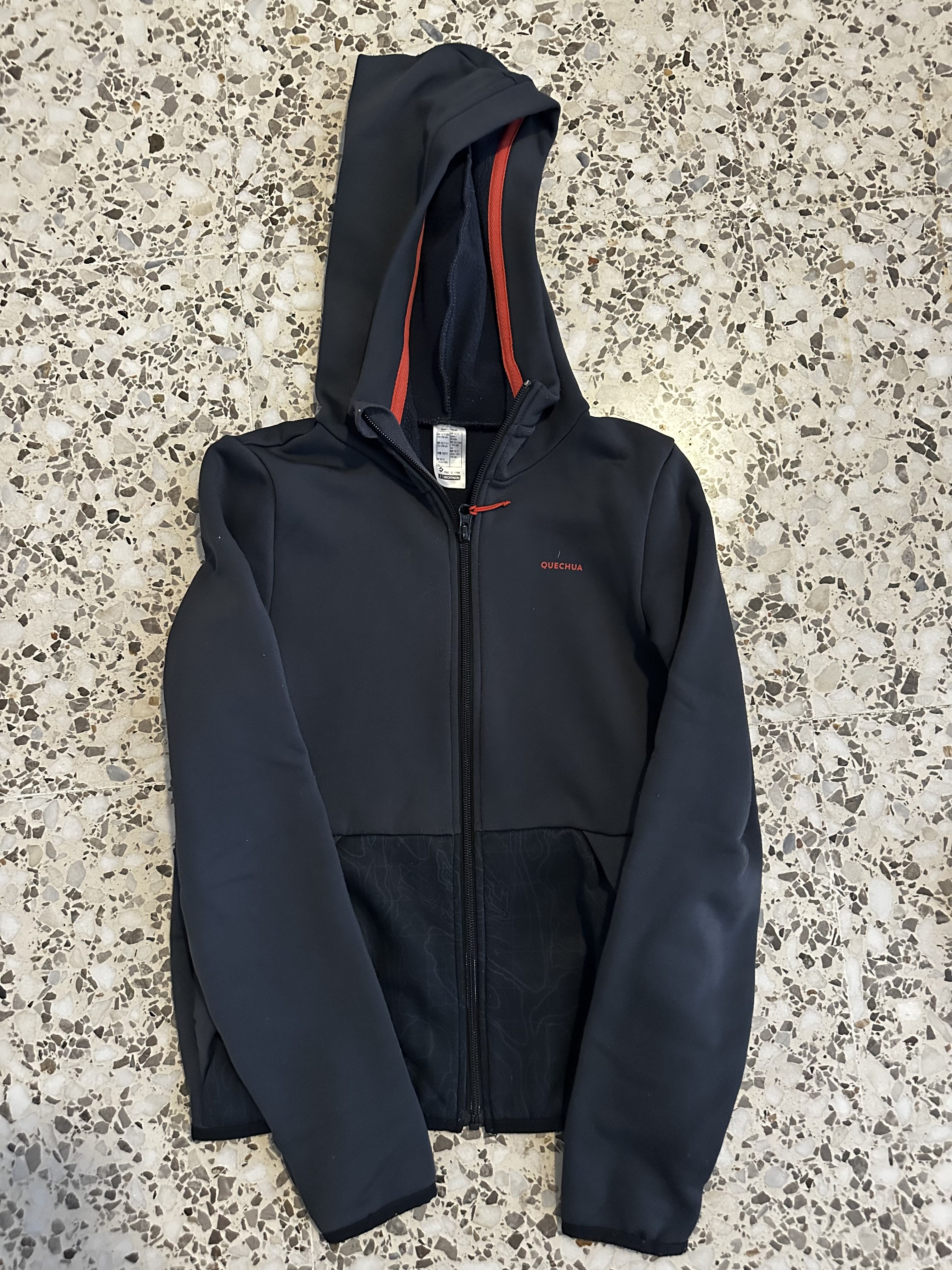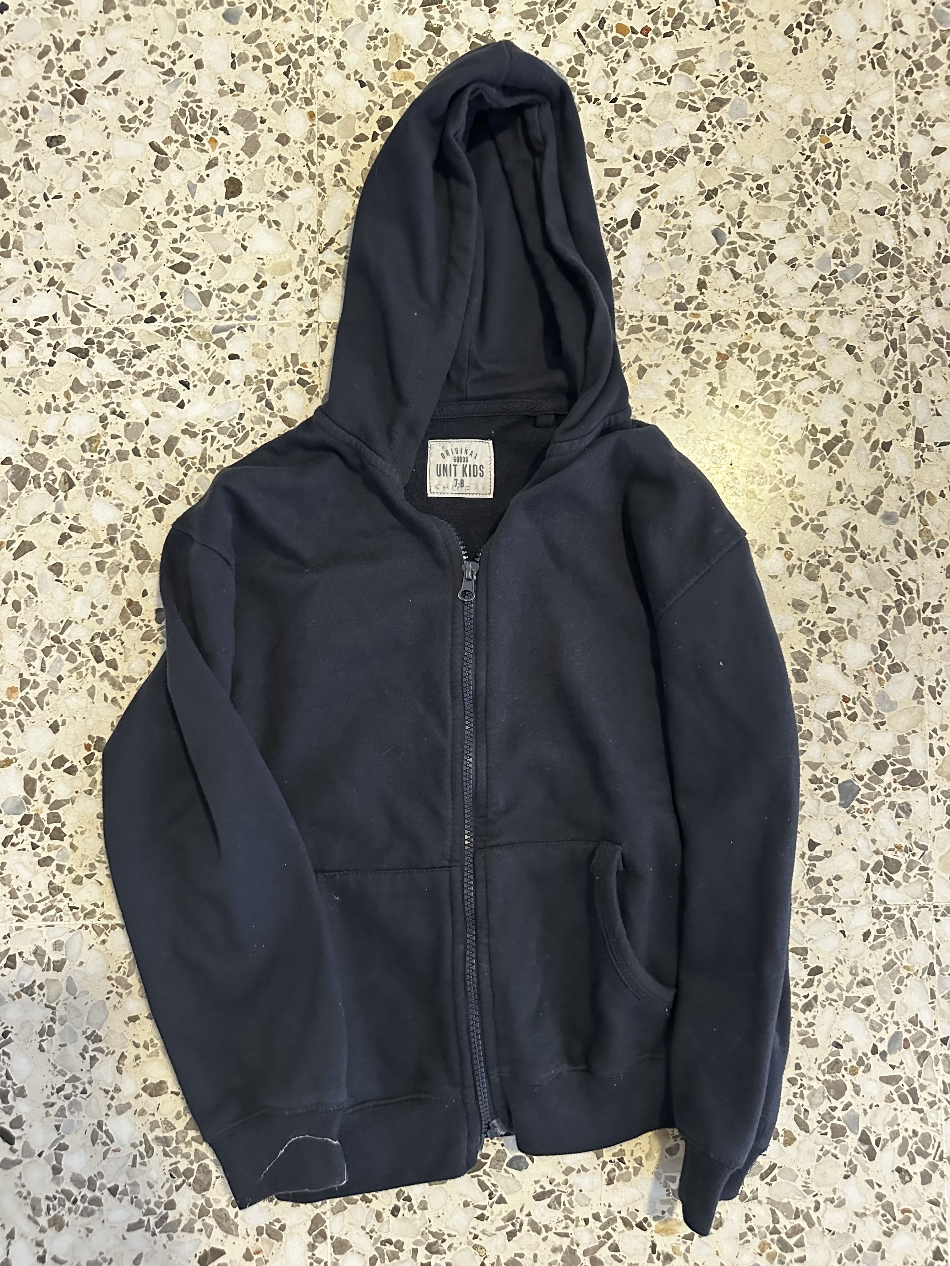 Sudadera azul marino con capucha, cremallera y bolsillos.