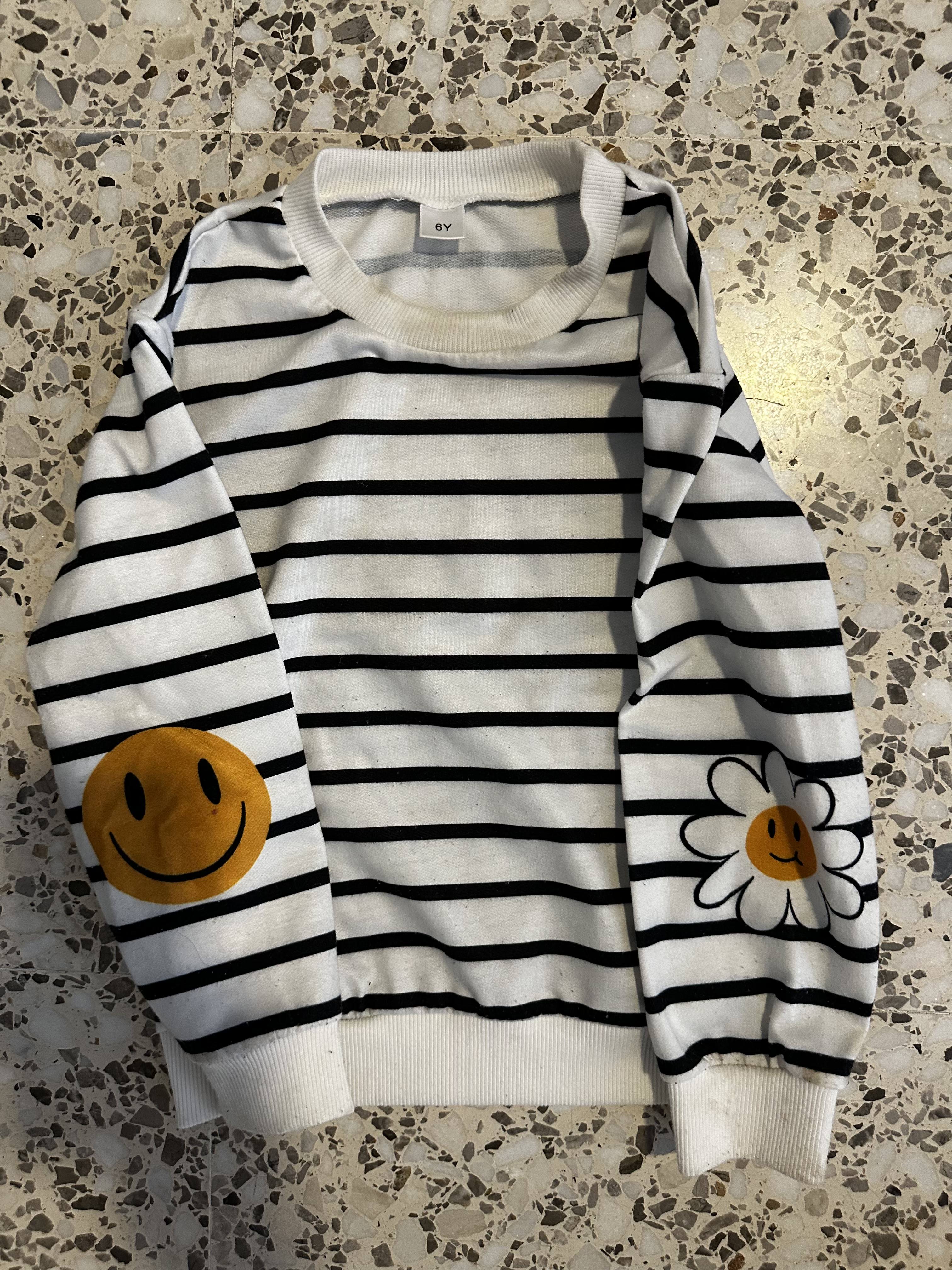 Sudadera de rayas blancas y negras, con smiley y margarita.
