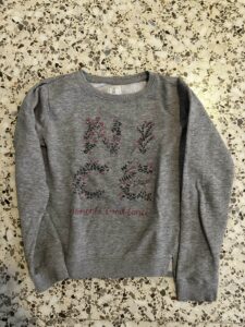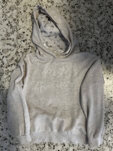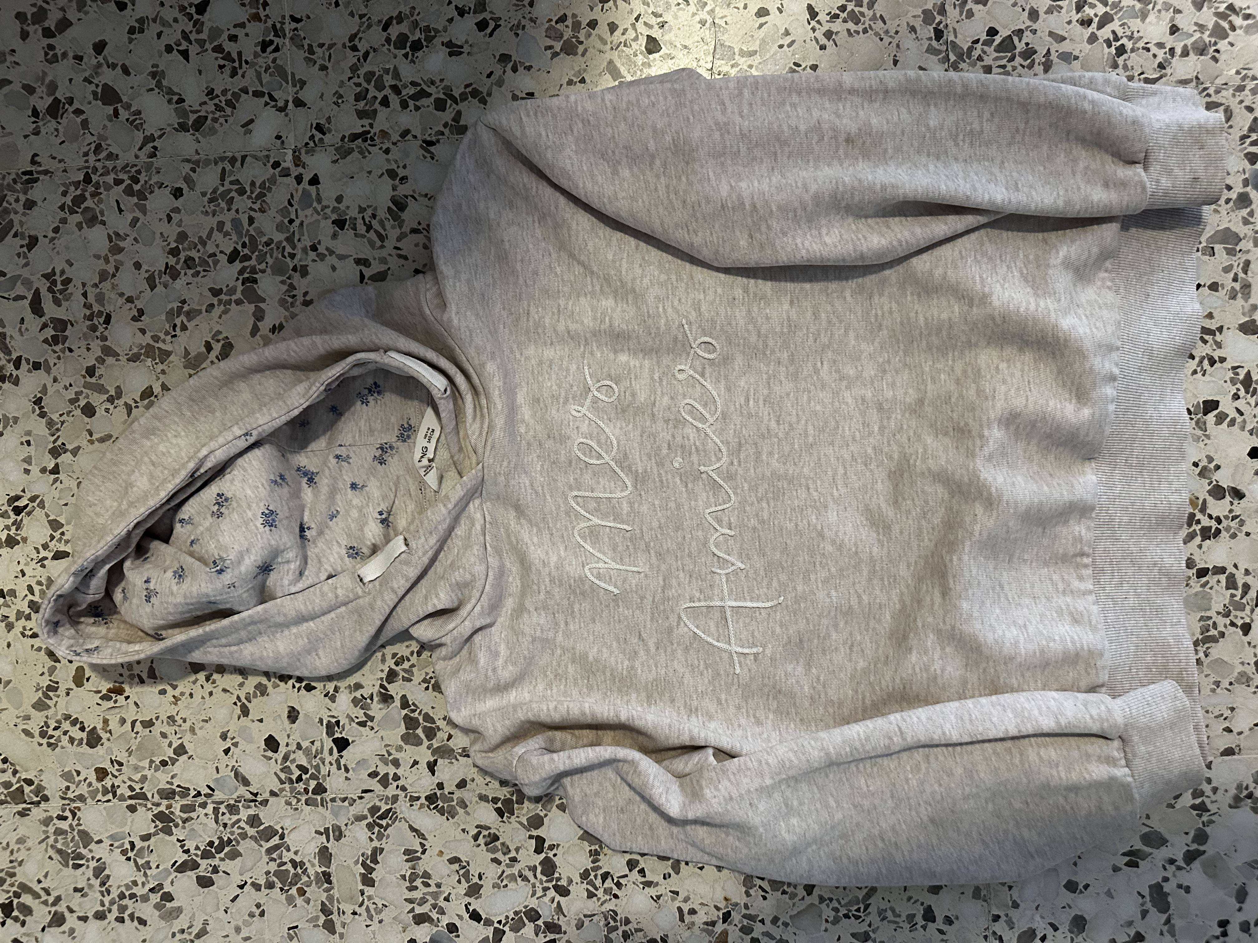 Sudadera gris con capucha e interior floral y texto “Mes Amies”.