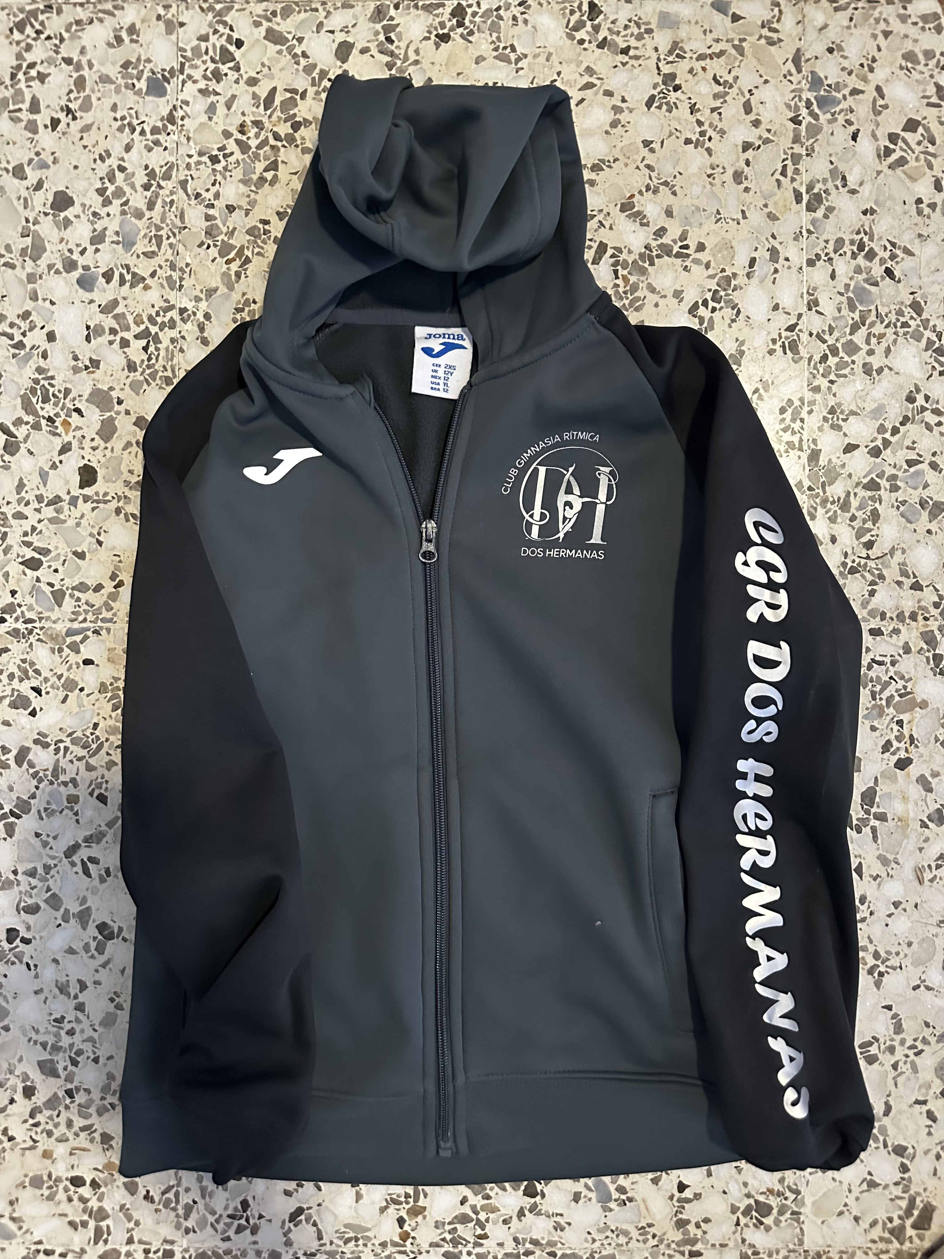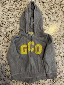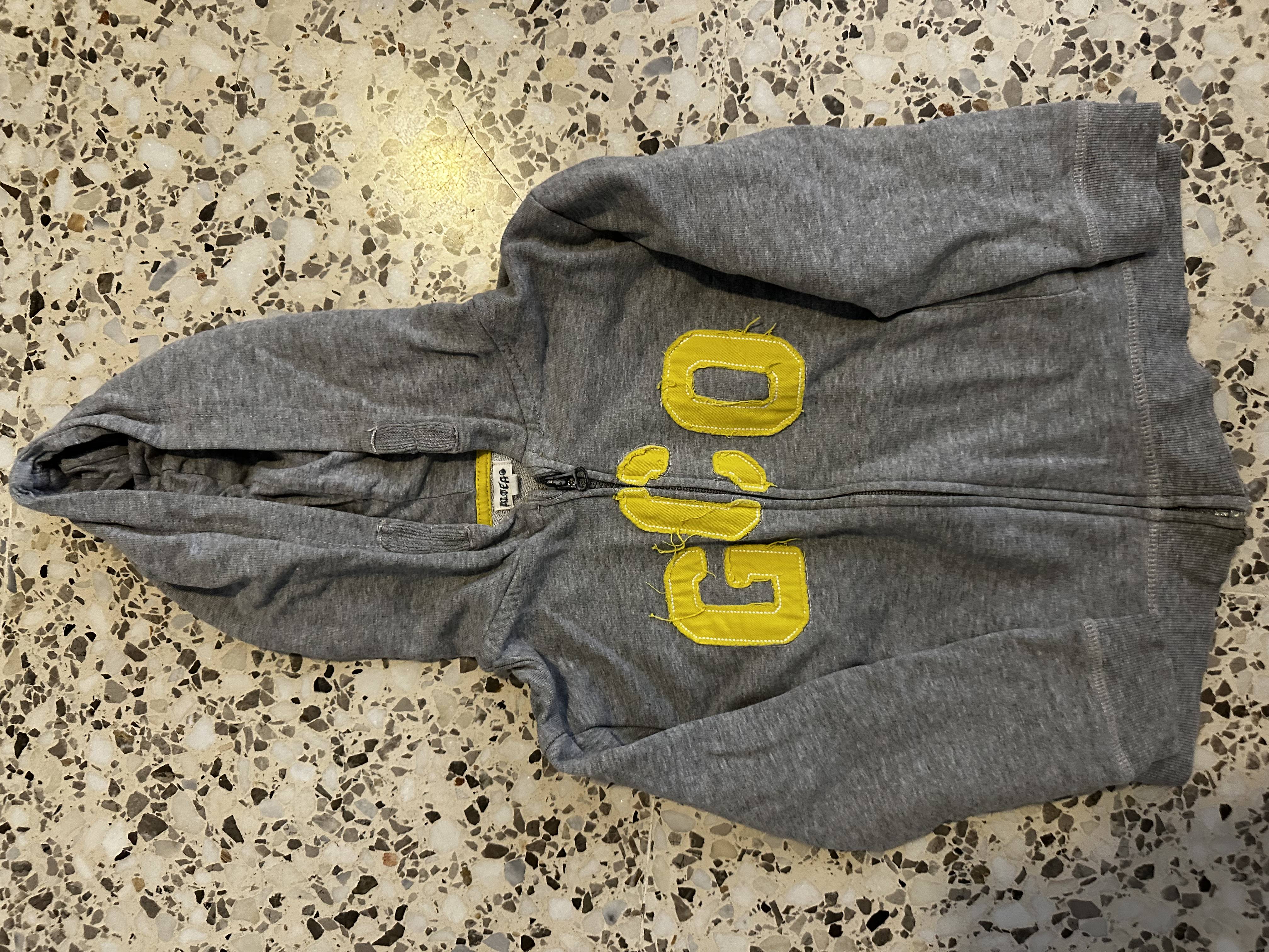 Sudadera gris con capucha, cremallera y letras amarillas “GCO”.