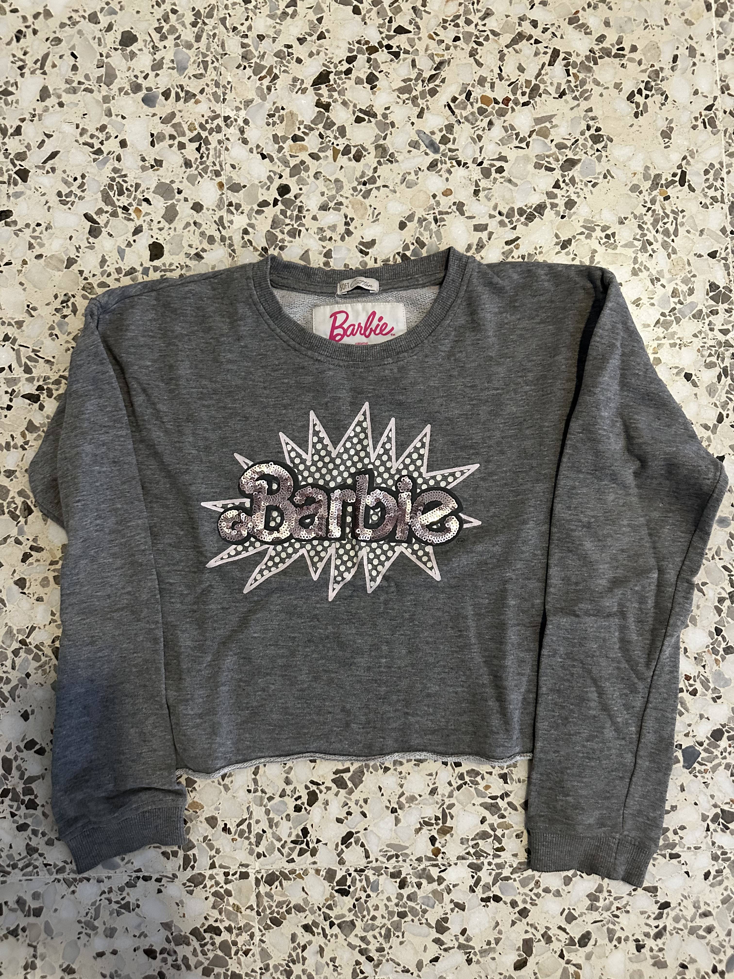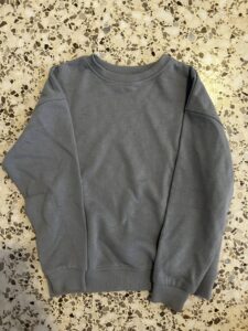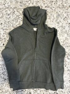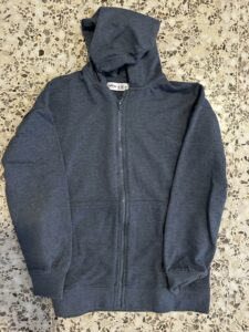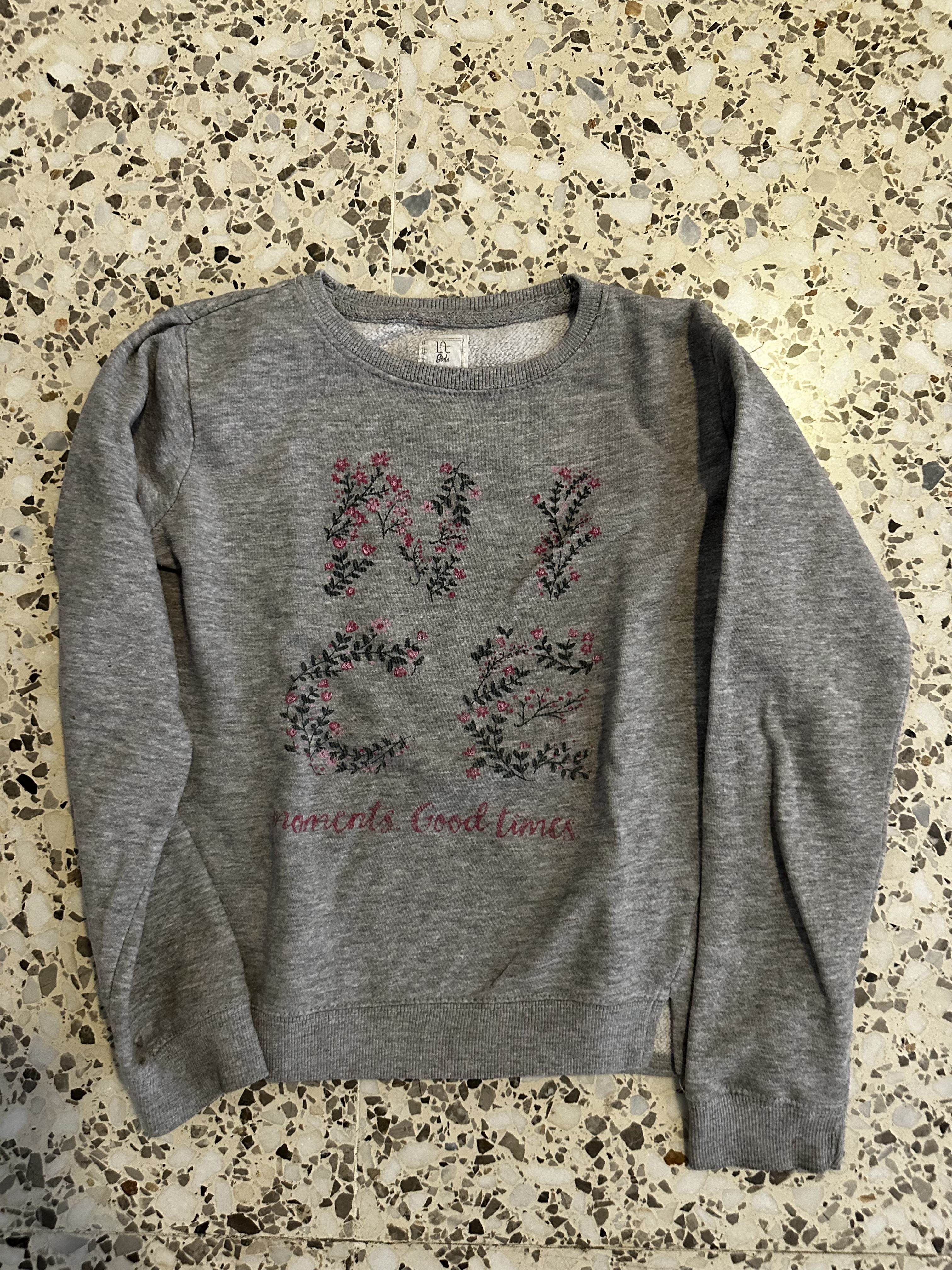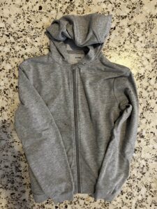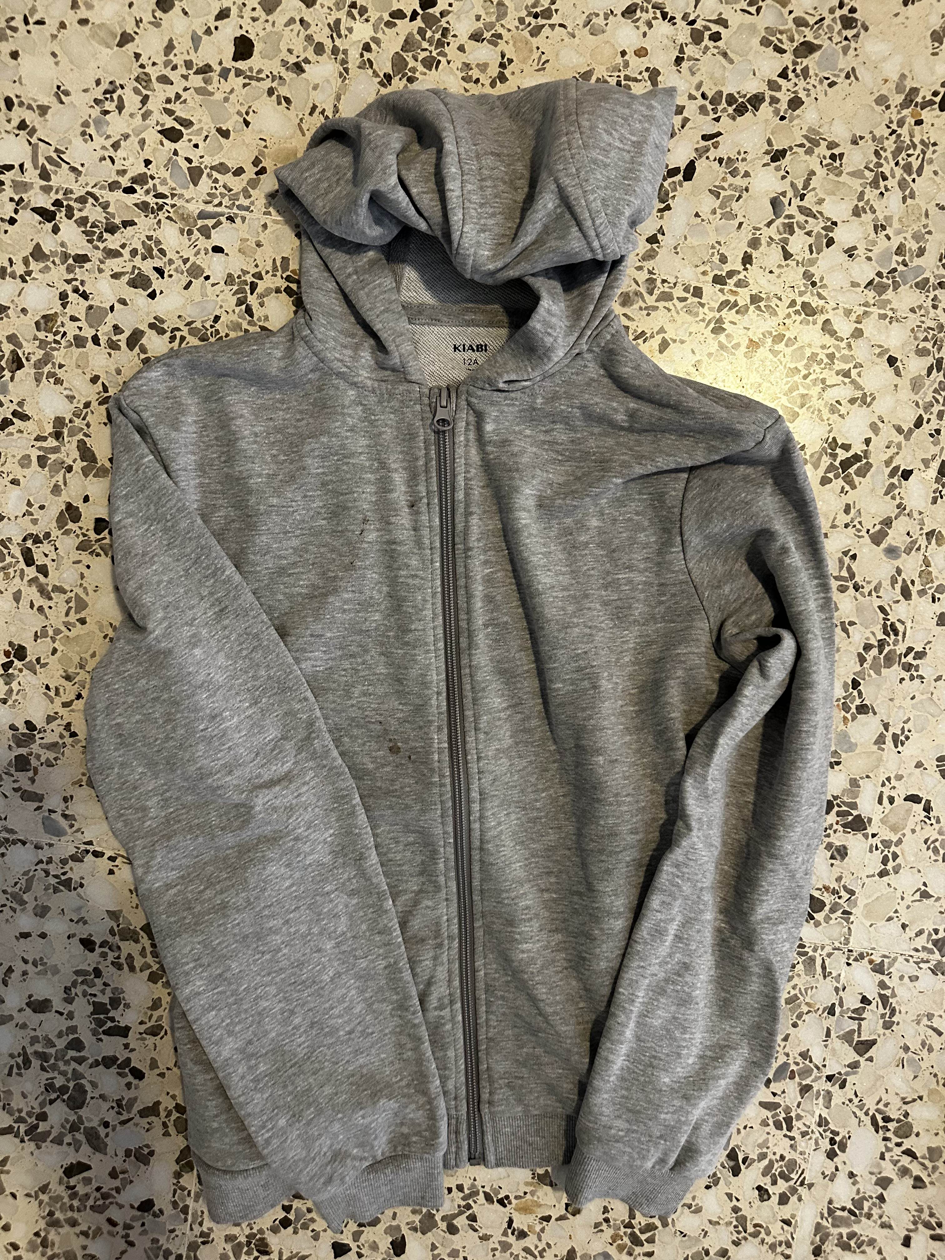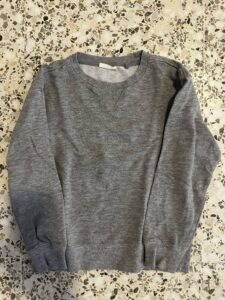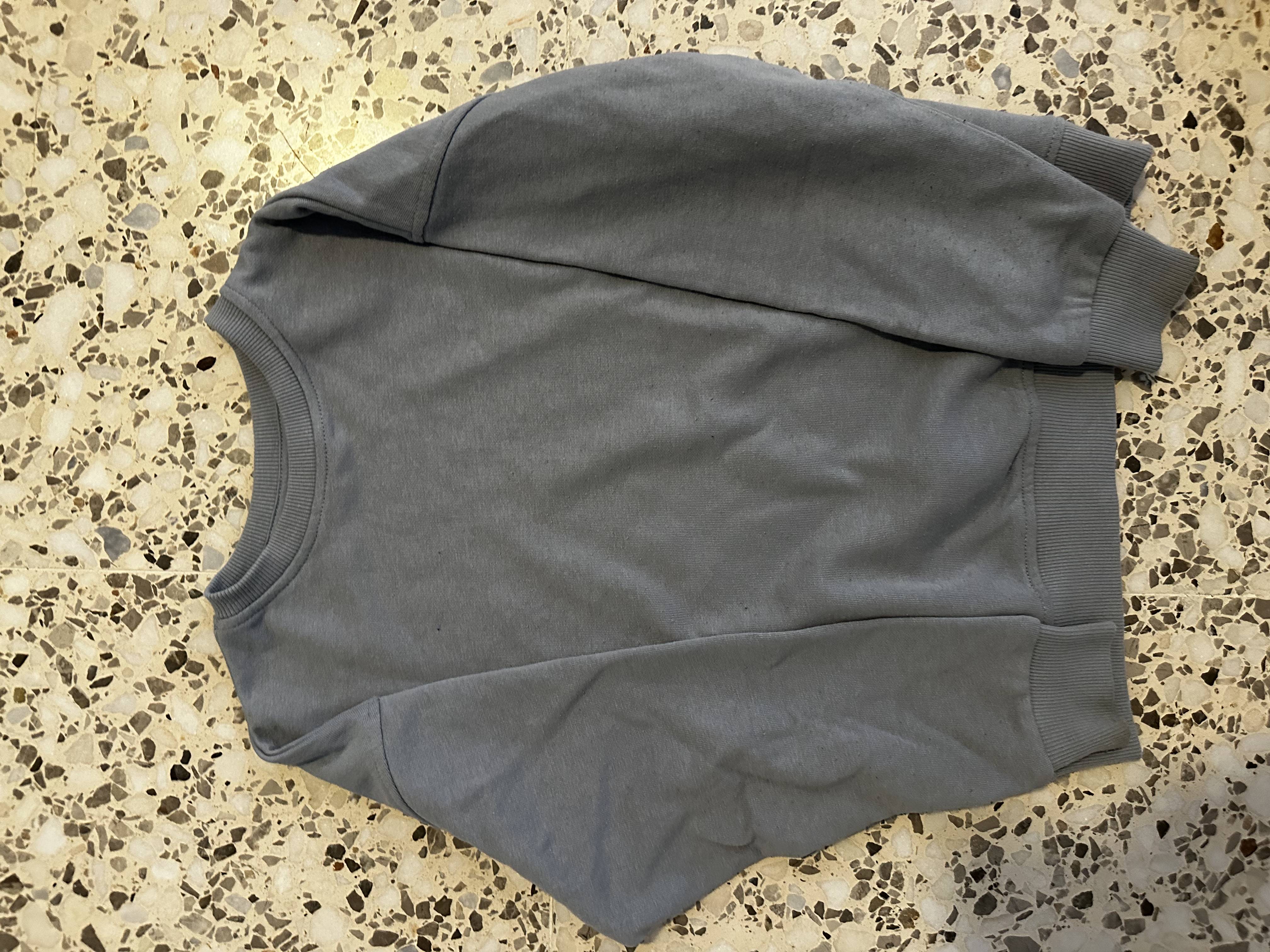 Sudadera gris básica, sin detalles ni estampados visibles.