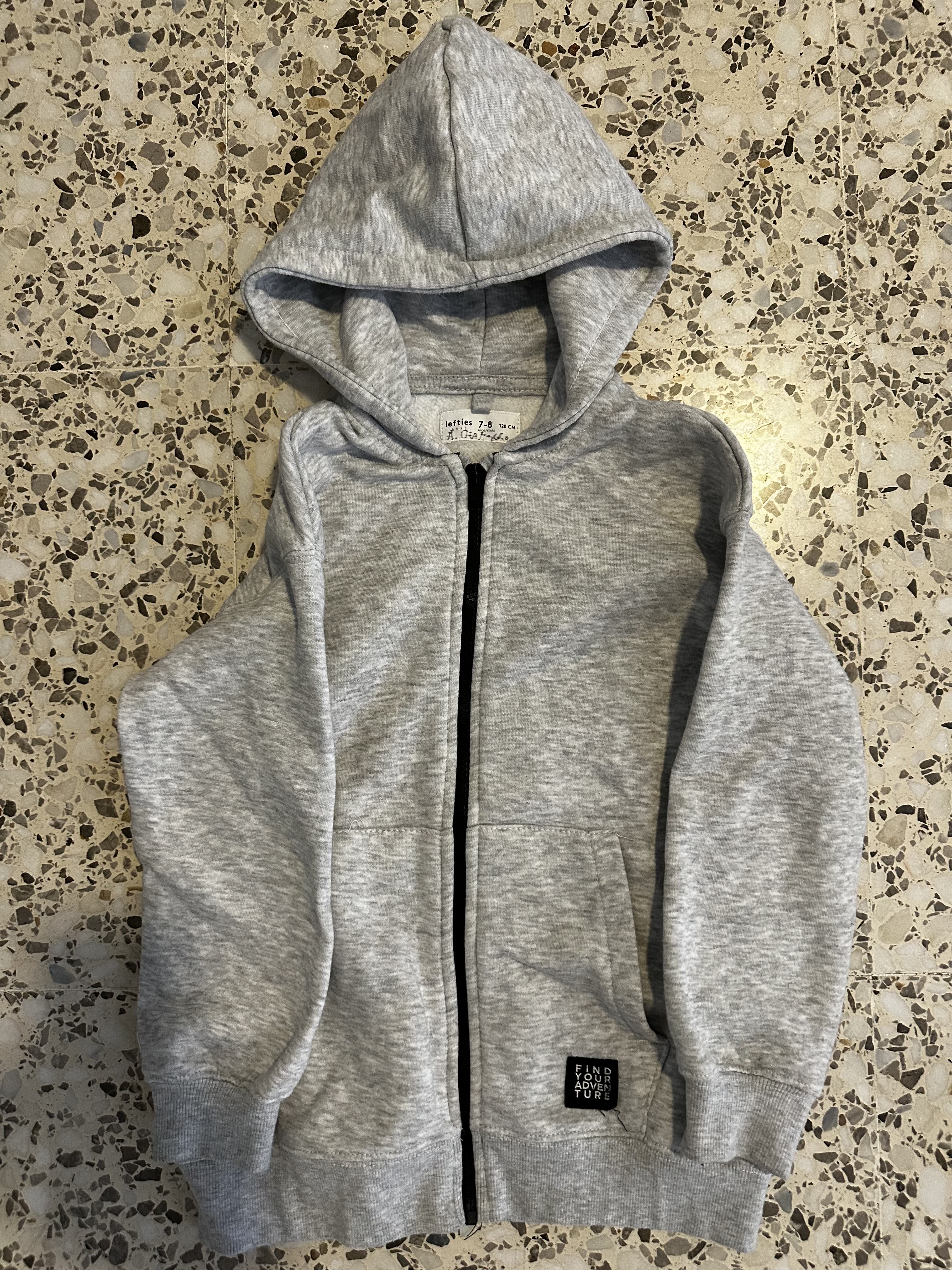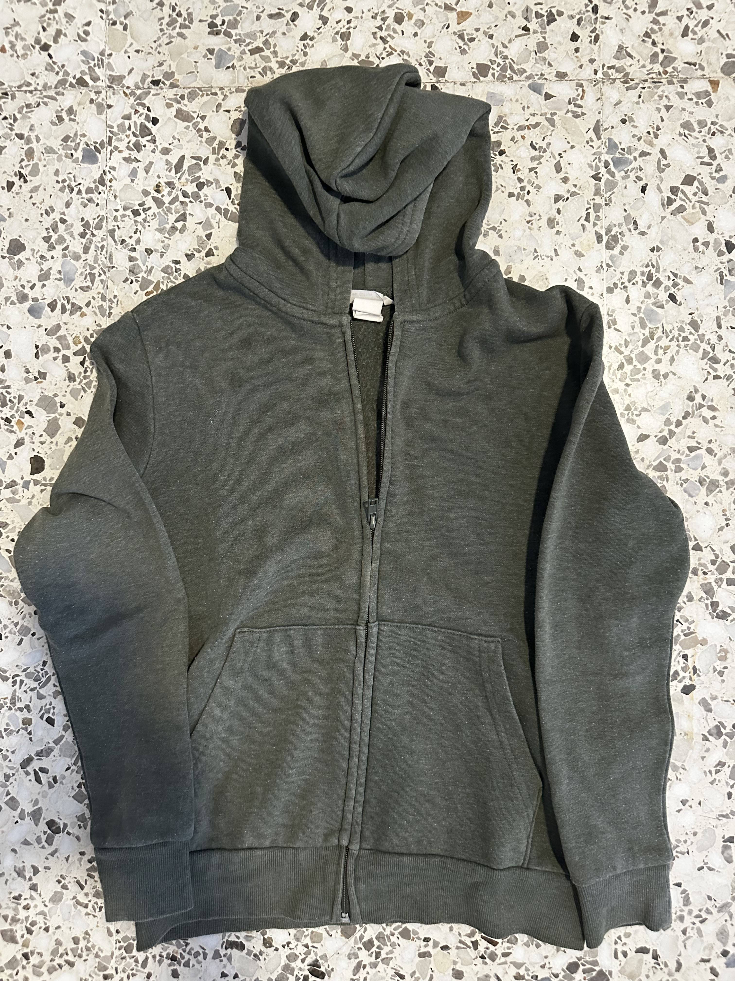 Sudadera gris con cremallera y capucha, interior afelpado.