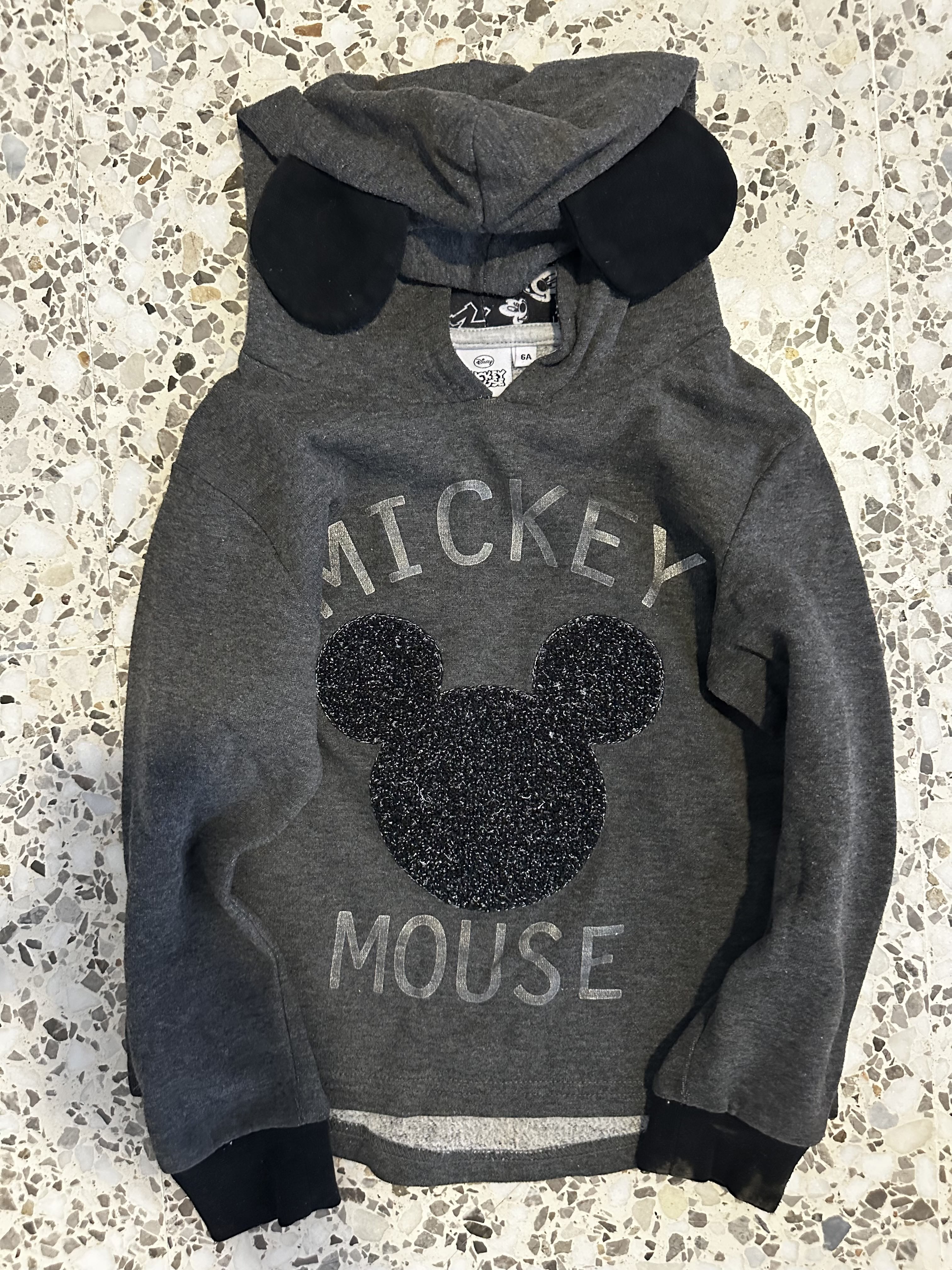 Sudadera con orejas de Mickey Mouse y letras brillantes.