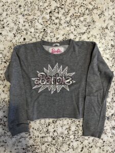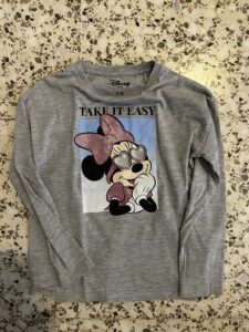Sudadera gris, dibujo Minnie Mouse y texto “Take it easy”.
