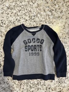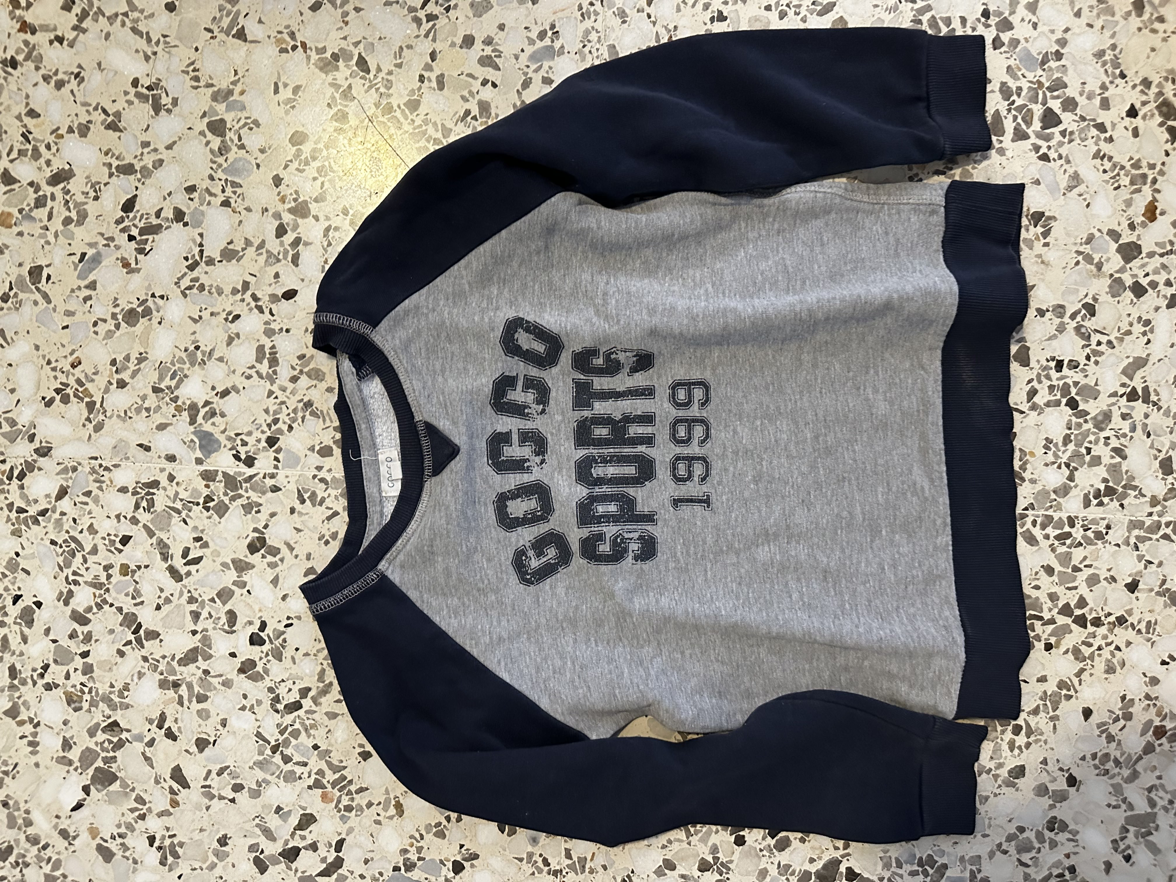Sudadera gris con mangas azul marino, texto “GOCCO SPORTS 1999”.