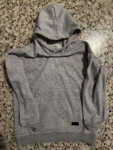 Sudadera gris con capucha, cremallera y letras amarillas “GCO”.
