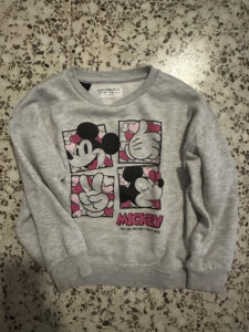 Sudadera gris, dibujo Minnie Mouse y texto “Take it easy”.