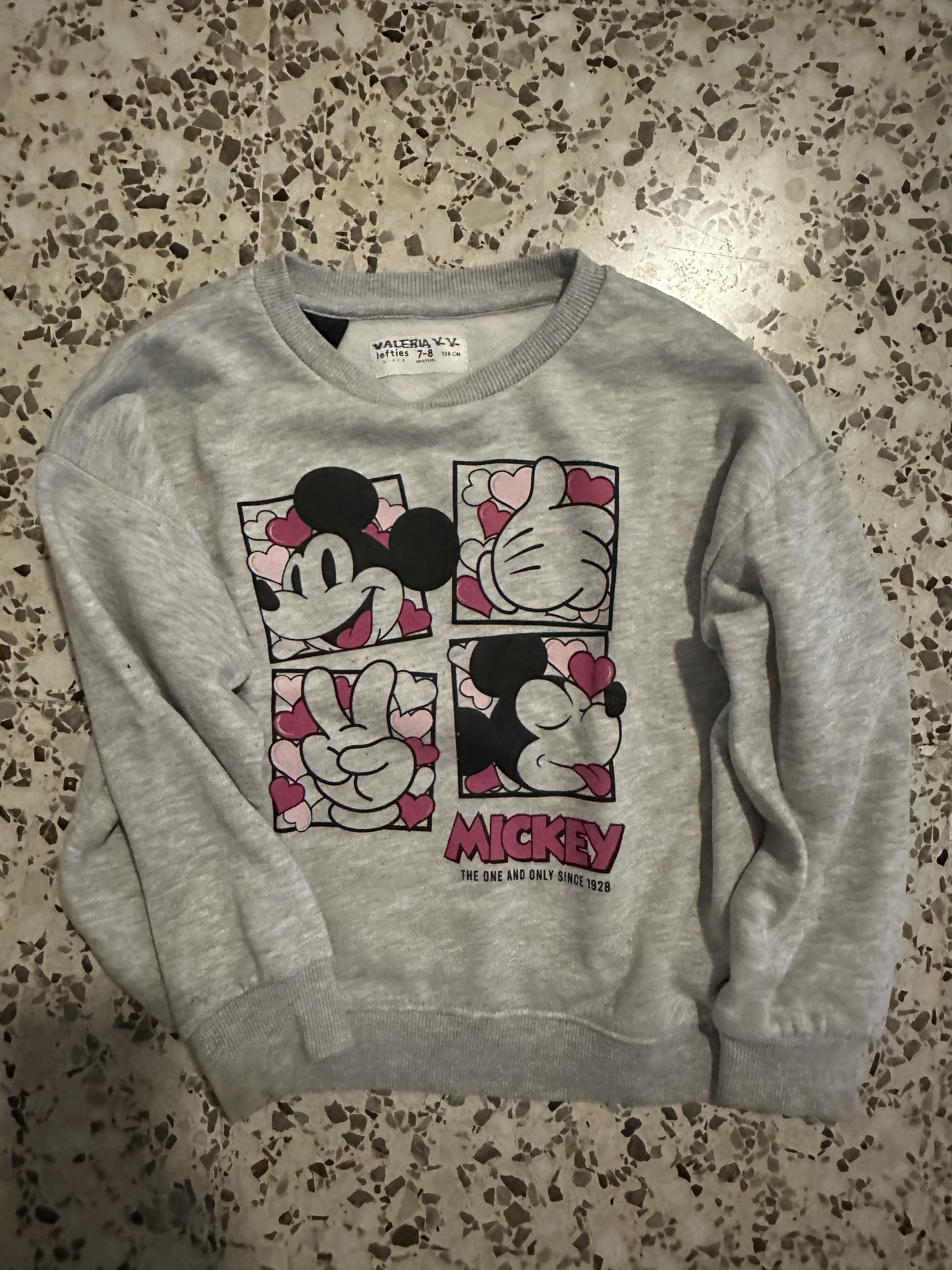 Sudadera con cuadros de Mickey y manos con corazones rosas. Cuello, puños y bajo de canalé.