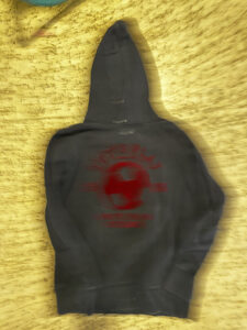 Sudadera gris con mangas azul marino, texto “GOCCO SPORTS 1999”.