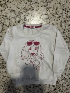 Sudadera blanca con dibujo de chica rubia con gafas rosas y detalles brillantes.