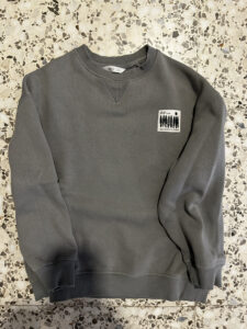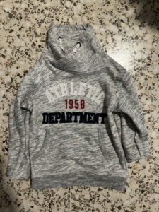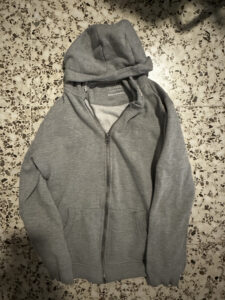 Sudadera gris básica, sin detalles ni estampados visibles.