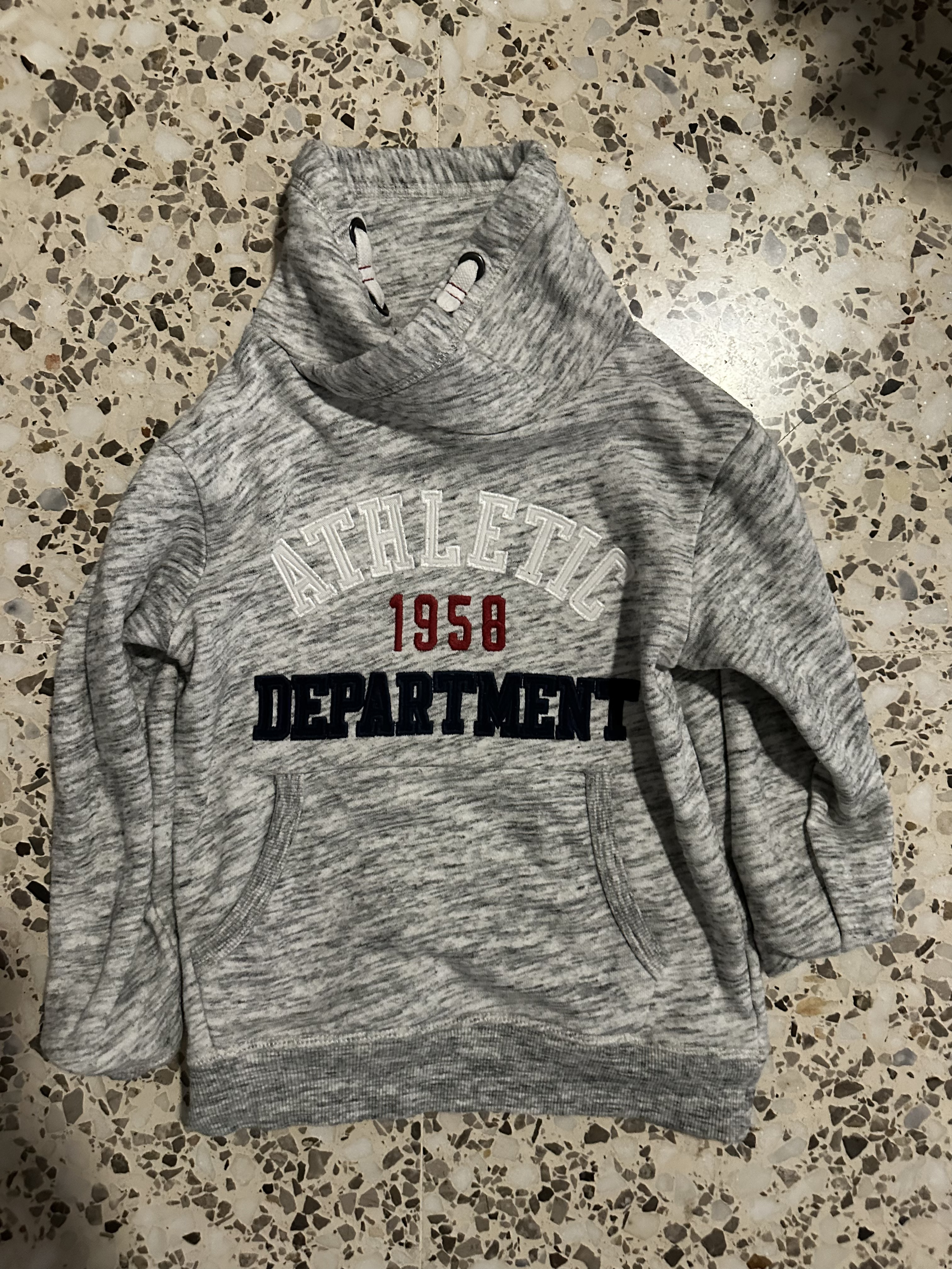 Sudadera gris jaspeada con capucha y bolsillo delantero.