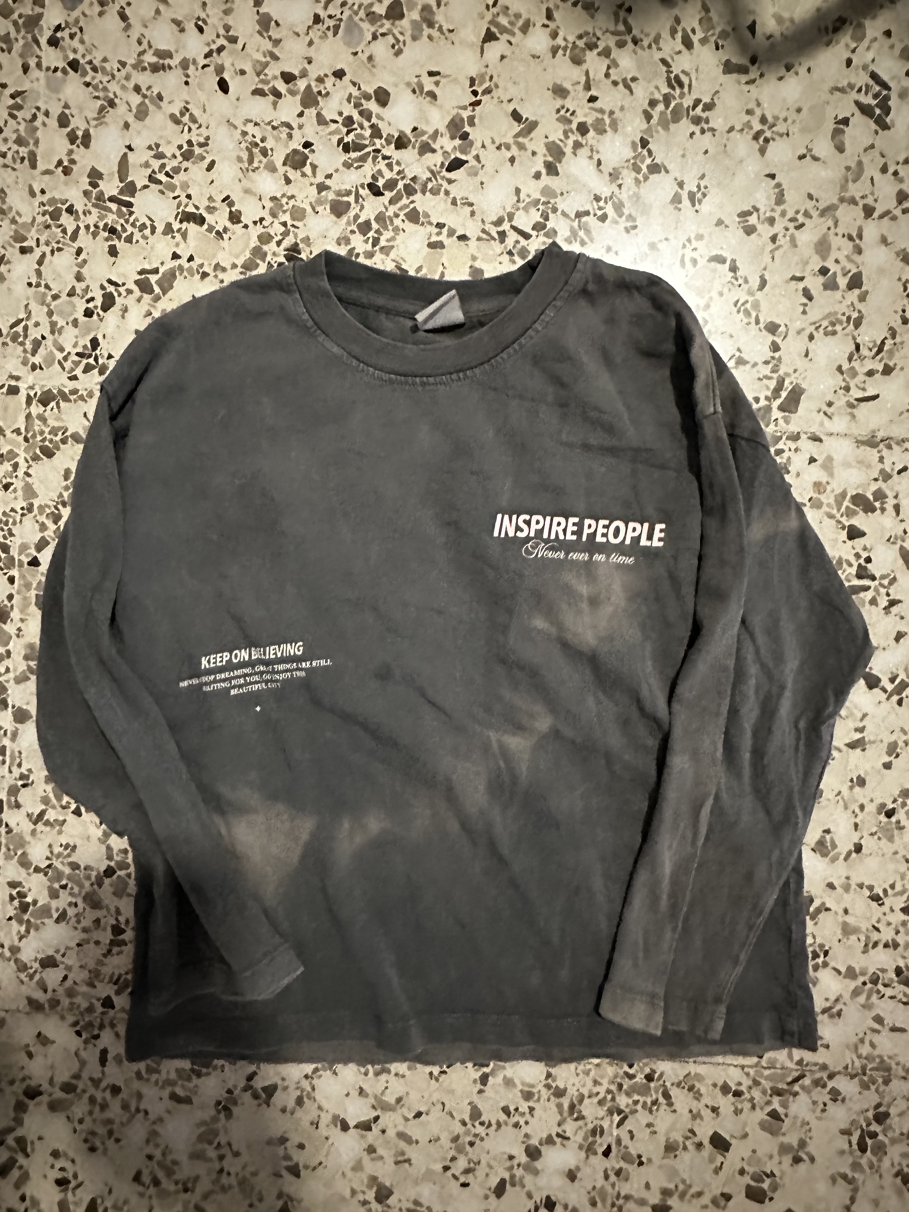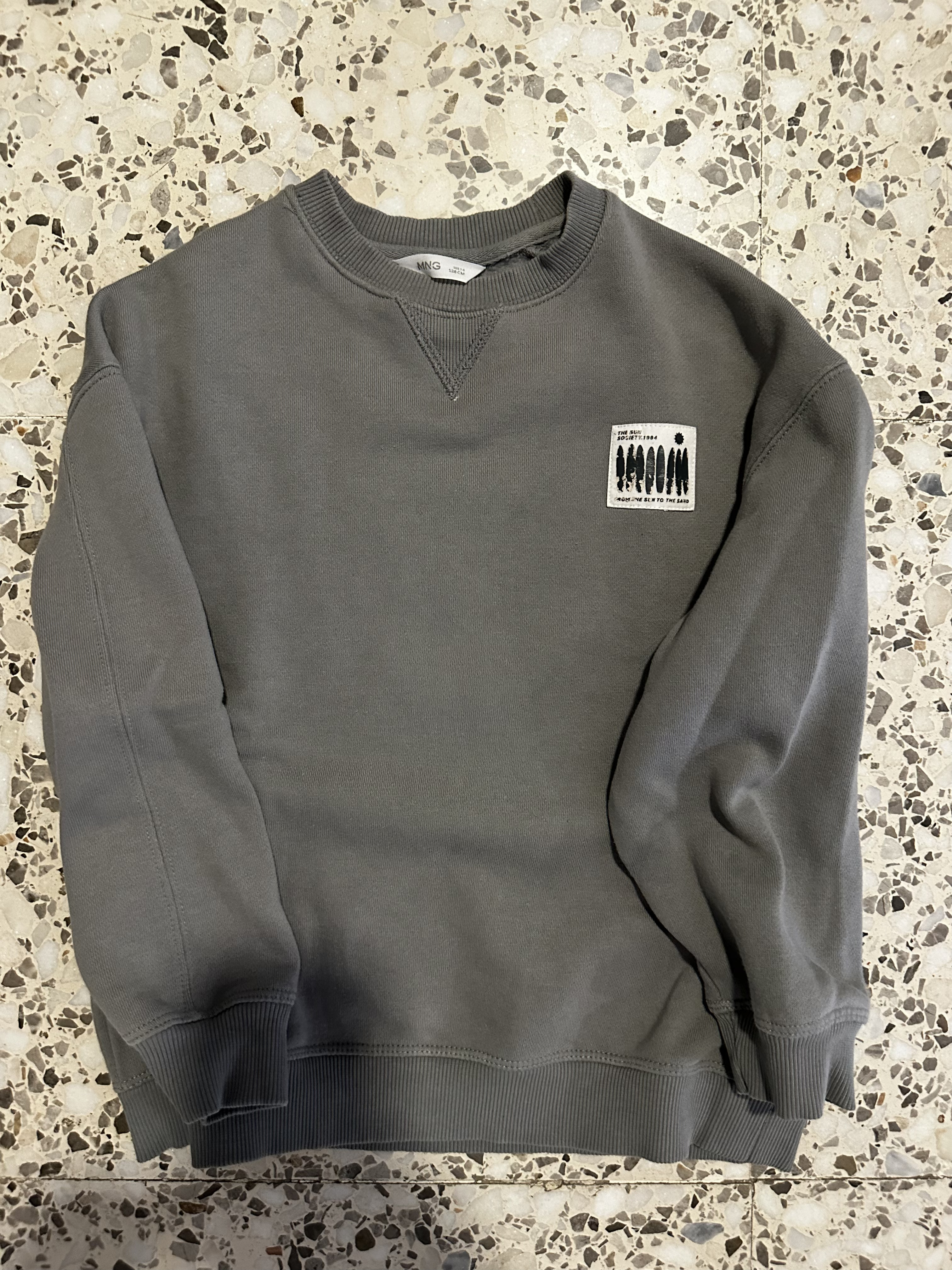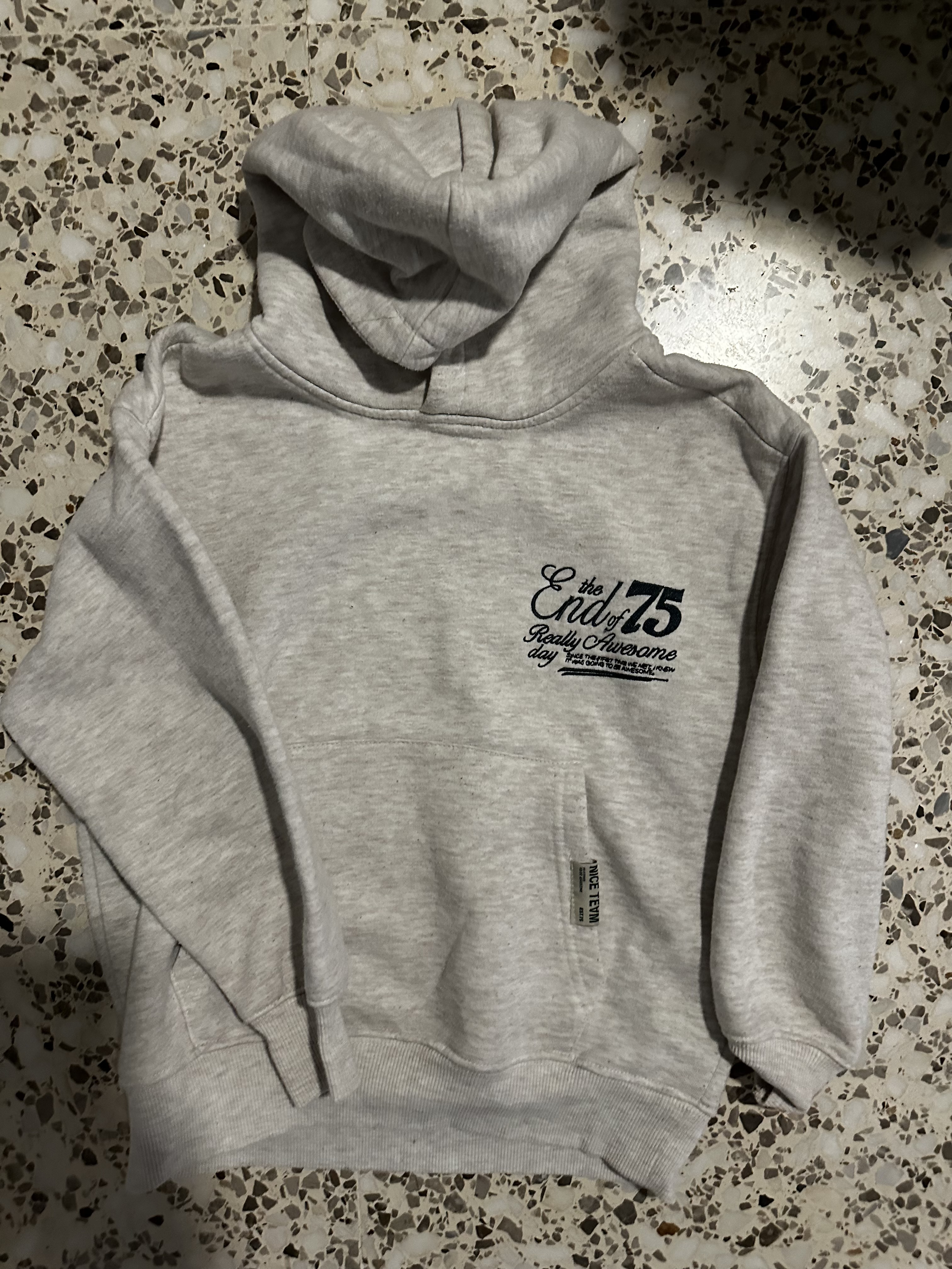 Sudadera gris, letras florales “NICE moments Good times”.