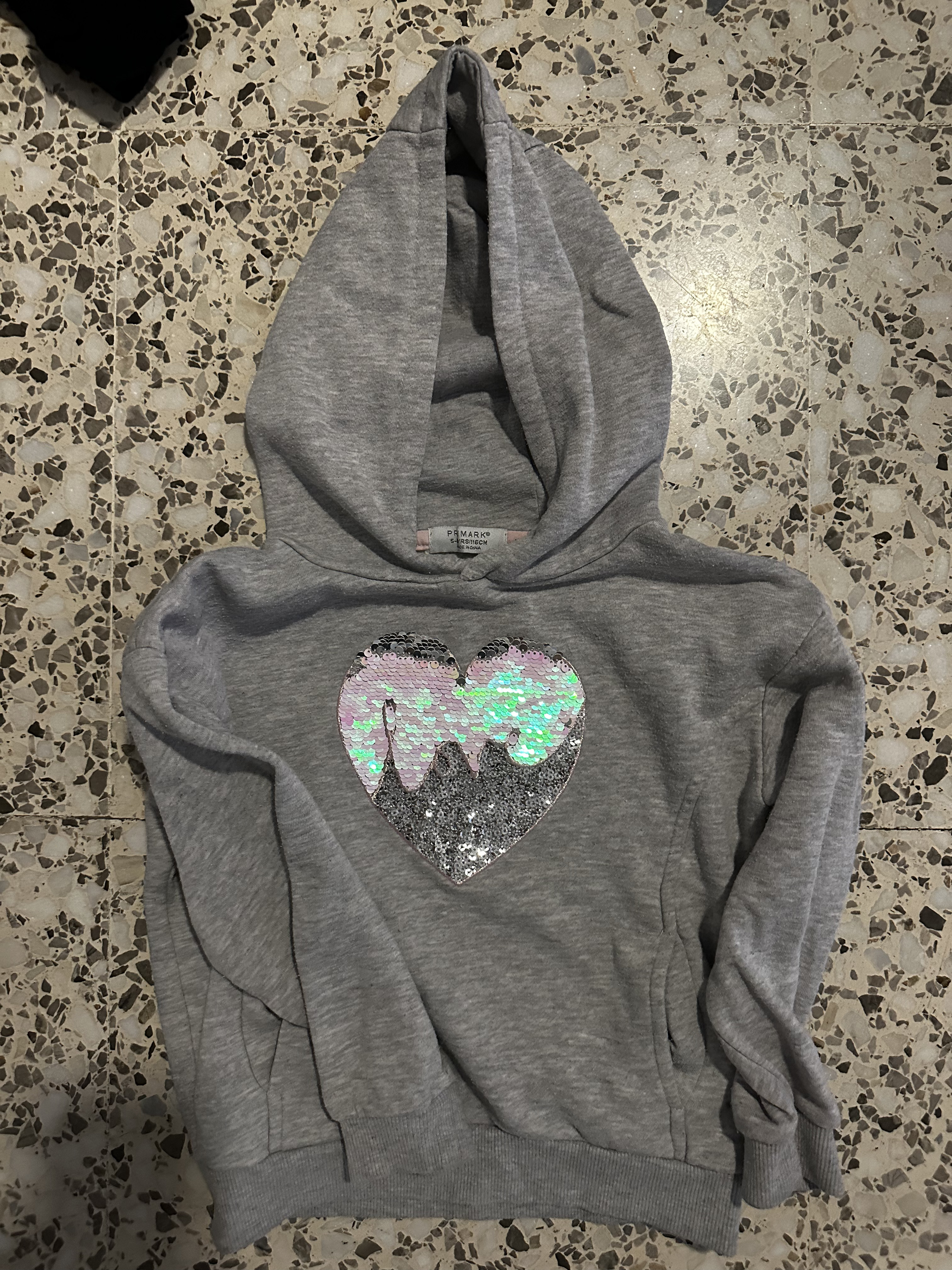 Sudadera con capucha y bolsillo canguro, gran corazón de lentejuelas reversibles en el pecho.