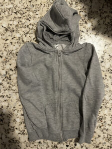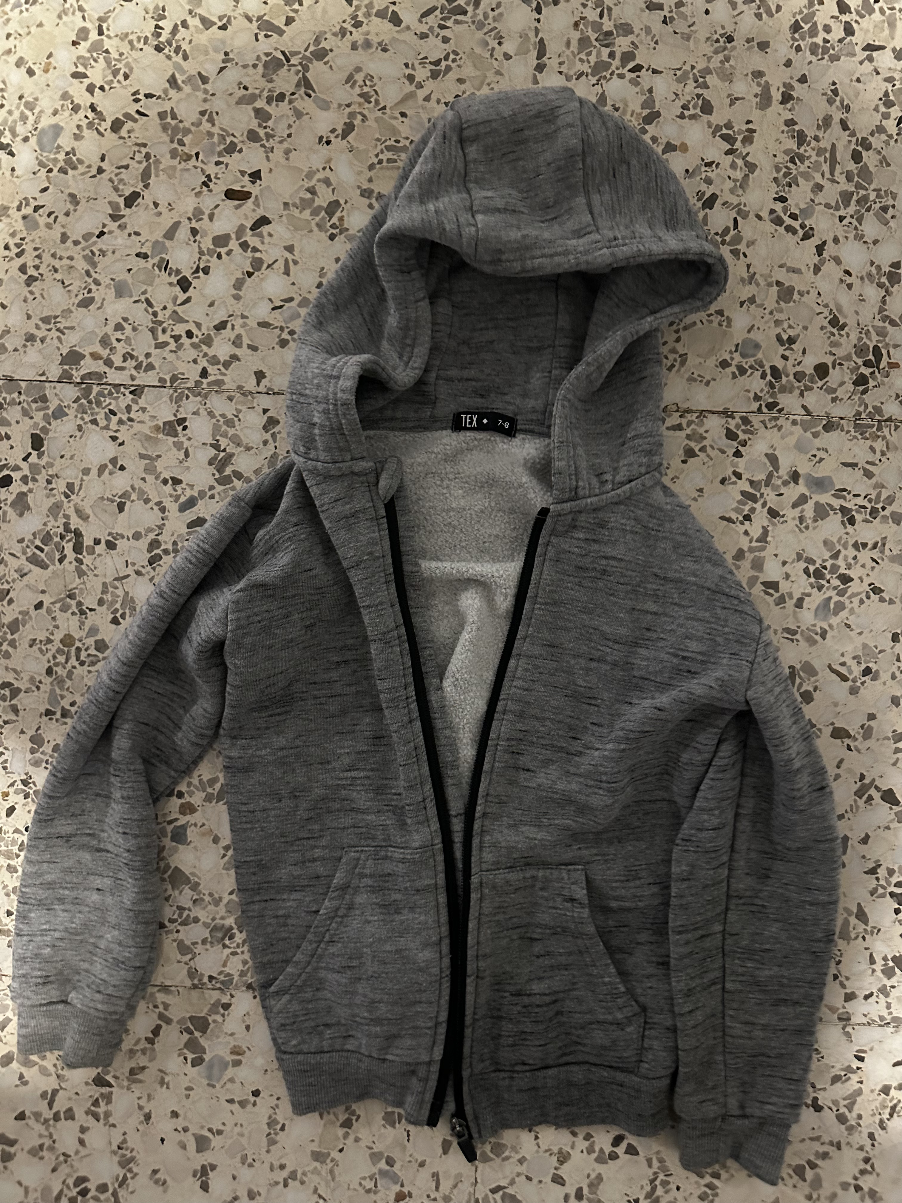 Sudadera básica gris con capucha y cremallera central, bolsillos tipo canguro.